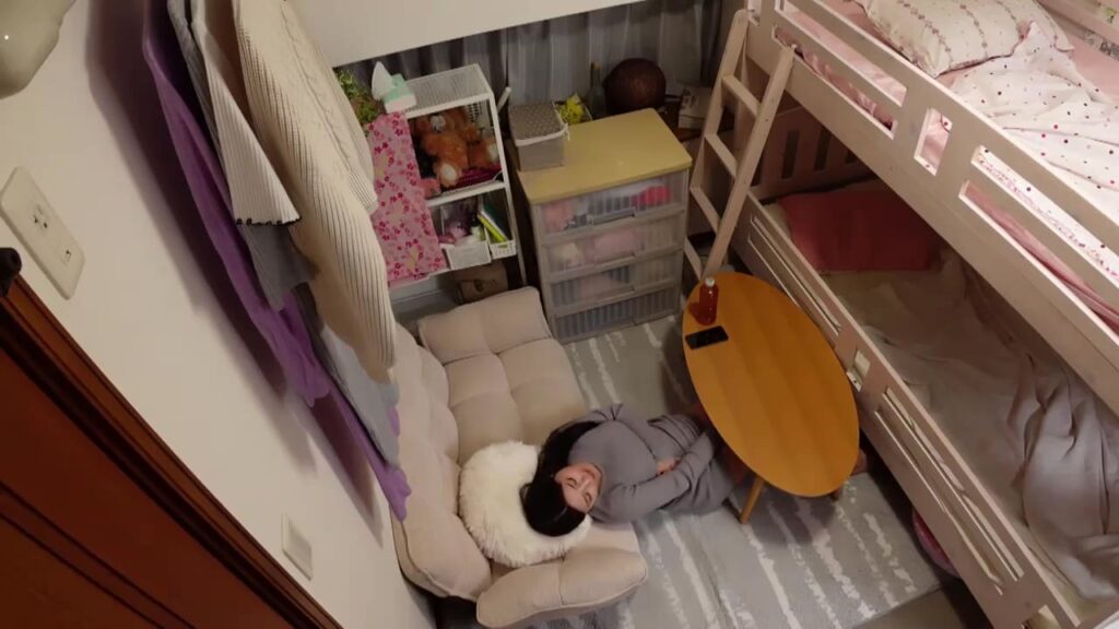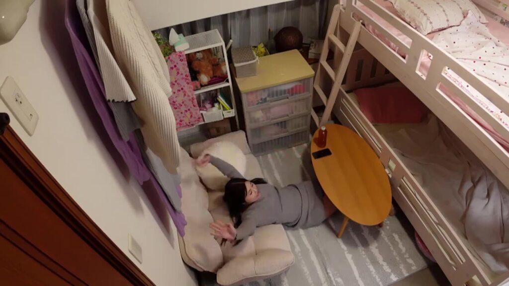 右手を股の間に挟み、しばらくクネクネと悶えるように自らの身体をいじっていましたが、突然ピタッと手を止めたかと思うと、人がいないことを確認するかのように部屋を見渡し、身体を起こしてベッドに向かいました。